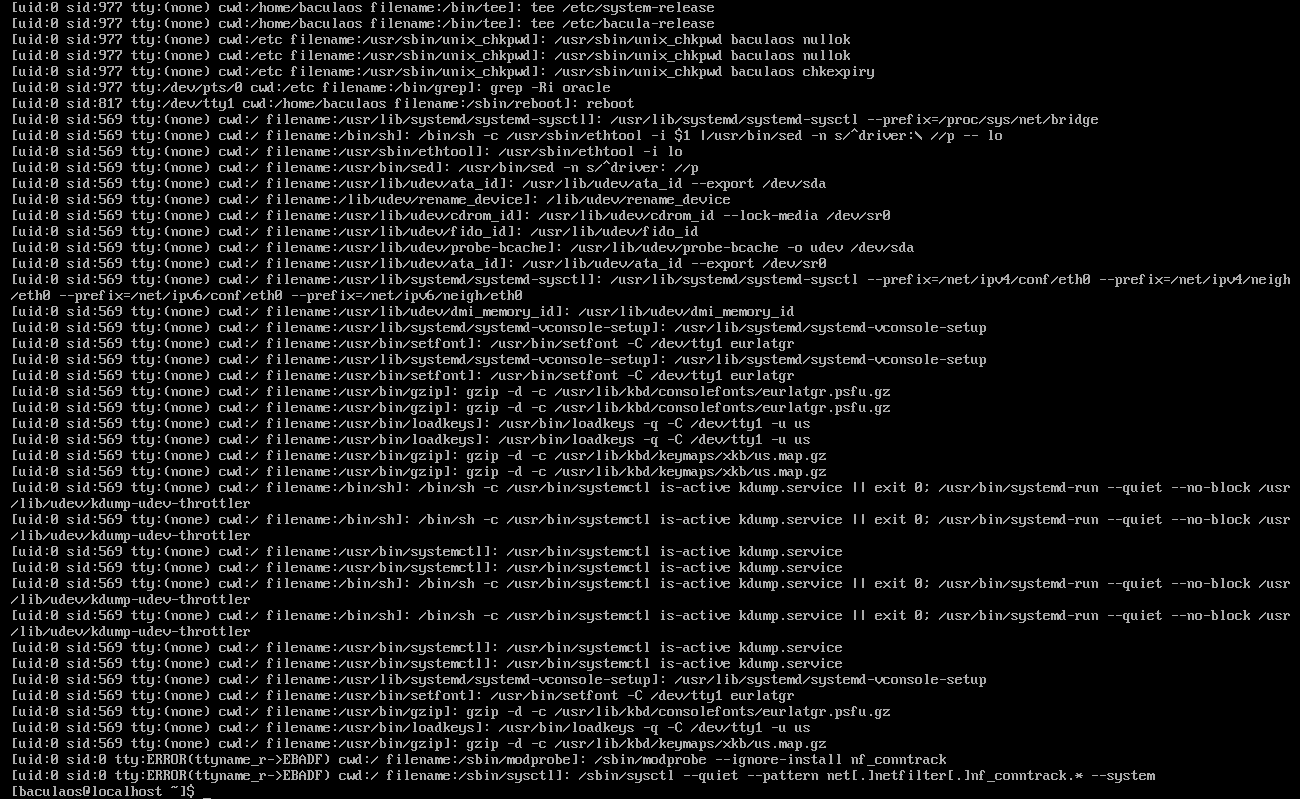 • Auditoria Avançada para Operações de Baixo Nível: o BaculaOS habilita a auditoria detalhada para comandos do sistema operacional e chamadas de sistema, registrando todas as atividades. Isso permite um monitoramento detalhado e facilita a identificação e resposta a atividades suspeitas.